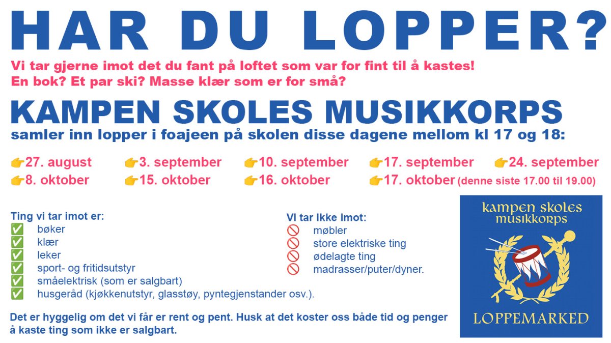 Kampen skoles musikkorps arrangerer loppemarked på høsten, nærmere bestemt 17.-17.oktober 2026